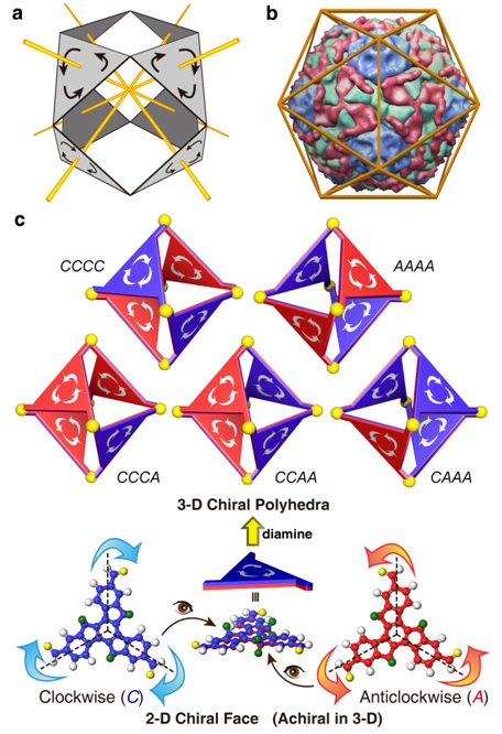 自然界中正二十面体病毒衣壳的面上蛋白质亚基具有朝同一方向“旋转”的特性(图b),数学家也将此面方向性引入多面体中以增加其复杂度(图a)。化学家们通过分子组装制备了种类众多的分子多面体。这些分子多面体大致分为两类:一类构筑分子基元为棱,其多面体面为空;另一类是由高对称性的平面分子构筑基元组装而成,而具有面方向性的分子多面体尚未见报道。