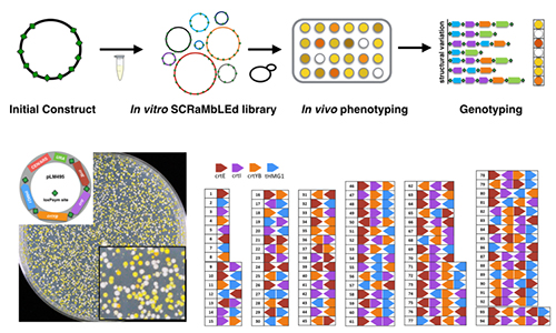 研究团队开发了一种体外DNA重排技术,通过Cre酶与包含多loxPsym位点DNA的体外反应体系构建,产生了含有基因删除、反转和复制的结构变异文库,并且使用单分子实时测序技术表征了结构变异文库的多样性(图2)。该体外重排技术提供了一种独特且高效的构建DNA文库方法,有助于开展便捷的表型和结构变异基因型关联分析,对结构变异的基础研究与代谢通路的工程优化具有重要意义。