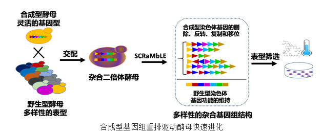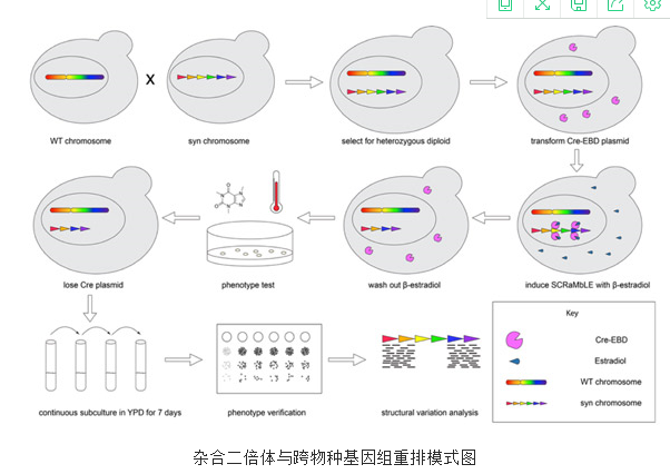 最近,天津大学和纽约大学合作在Nature Communications杂志在线发表了题为“Heterozygous diploid and interspecies SCRaMbLEing”的研究论文。该研究首次将合成型酵母基因组(Sc2.0)的重排系统拓展到杂合二倍体和跨物种二倍体,并且利用基因组重排系统快速驱动细胞进化(模式图附后)。该技术一方面有助于加速工业微生物的性状改良,另一方面对于挖掘新的生物学知识有重要意义。