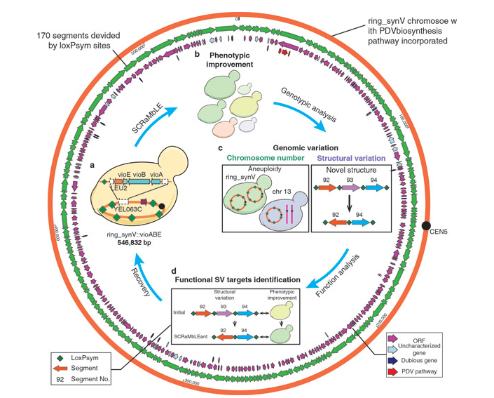 染色体结构变异对生物表型多样性具有重要的影响。该研究以含有环形5号染色体的单倍体酿酒酵母菌株为模型,利用合成型酵母染色体特有SCRaMbLE系统研究基因组结构变异和进化,揭示了环形染色体可以连续产生复杂的基因组变异和表型优化。