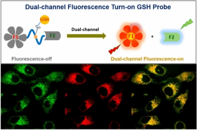 针对上述问题,尹军和刘盛华教授研究团队在团队前期工作基础上进行合理设计。他们分别以萘酰亚胺和吲哚菁绿为可见光通道及近红外光通道荧光团,以磺酰胺为双荧光团链接基团,构建了一个以生命体内广泛存在的抗氧剂谷胱甘肽为检测分析物的分子探针。在可见光通道与近红外光通道内,该探针均能高特异性地响应谷胱甘肽。通过以商品化探针为参比发现,其可见光通道内的绿色荧光与近红外光通道内的红色荧光能够同时特异性标记活细胞中的亚细胞器线粒体。该探针成功实现了活细胞内同一亚细胞器在两个完全不同的荧光通道内的同步荧光成像。此外,作者还通过多种谱学技术手段揭示了该探针的作用机制。该工作为今后发展具有高时空分辨荧光成像功能的有机荧光染料奠定了基础。